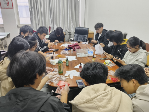 活动前期,主办方做好充分筹备,提前备齐扎染所需材料,并完成场地布置,为活动开展营造良好氛围。活动启动后,主持人先向同学们介绍扎染的历史文化与非遗价值,再通过示范讲解捆扎技巧与染色安全要点,帮助大家快速掌握操作核心。